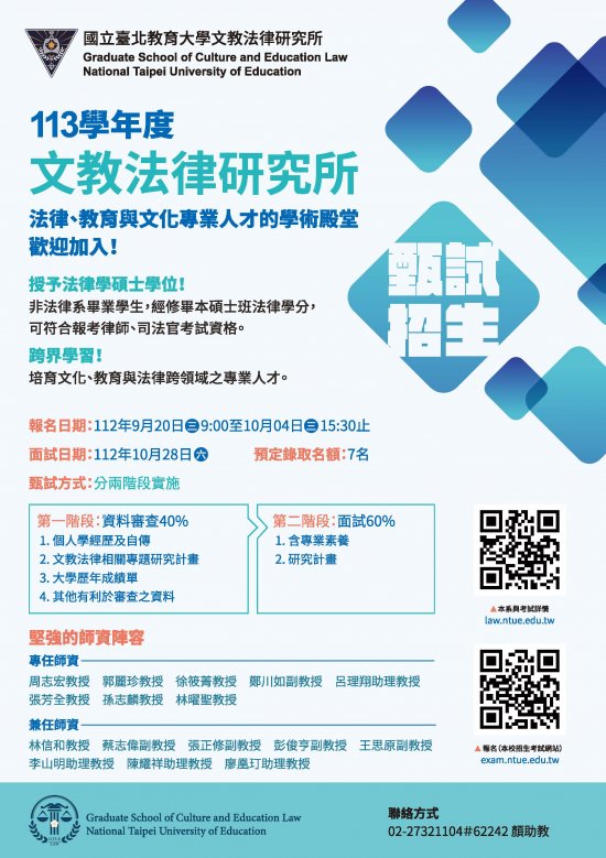 一、 該校文教法律研究所培育法律、教育與文化等專業人才,113學年度甄試入學刻正招生中。 二、 報名日期:112年9月20日(三)9:00至10月4日(三)15:30止。上傳資料期限至112年10月5日(四)17:30止。 三、 檢送該系招生海報一份。 四、 報名資訊請逕洽招生組或該所網站(http://law.ntue.edu.tw/)查閱,聯絡人:顏助教(文法),電話:02-27321104分機62242。