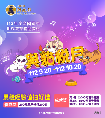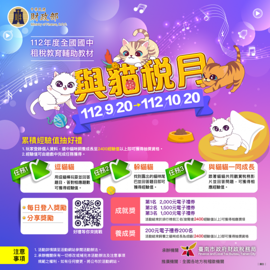有關臺南市政府財政稅務局辦理112年度全國國中租稅教育輔助教材「與貓稅月」線上遊戲抽獎活動,期間自即日起至112年10月20日止,敬請鼓勵民眾踴躍參加