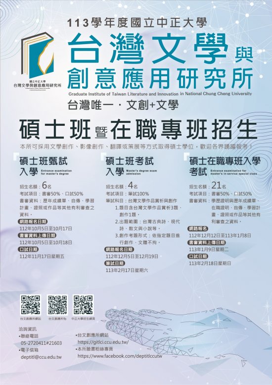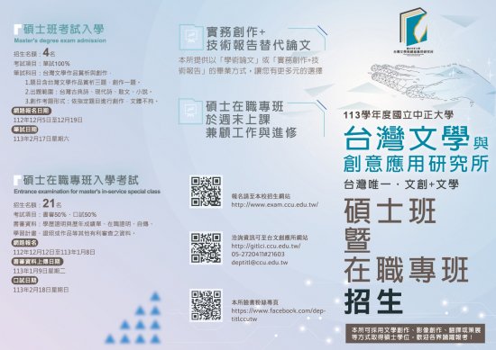 一、 該校台灣文學與創意應用研究所113學年度碩士在職專班報名時間於112年12月12日至113年1月8日止(採網路報名)。