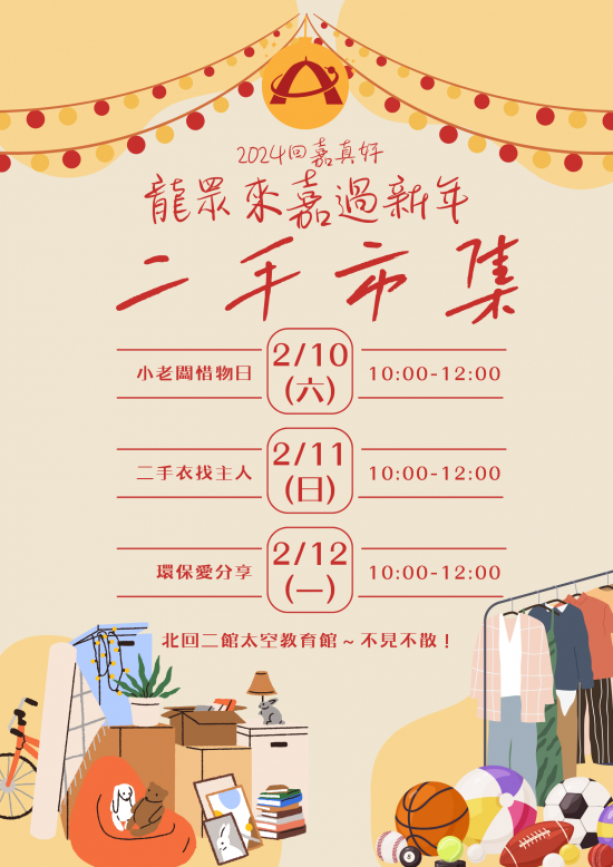 我們將在113年2月10日(星期六)至113年2月12日(星期一) 於北回二館太空教育館舉辦二手市集活動,誠摯邀請您們一同共襄盛舉!以分享代替購買!!!