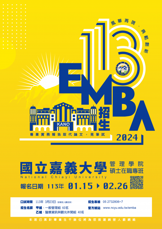 一、 旨揭招生報名日期自113年1月15日至2月26日下午5時止,一律採網路報名,招生簡章下載與報名網址:https://admissions.ncyu.edu.tw/www.aspx?webprjno=AAAG。