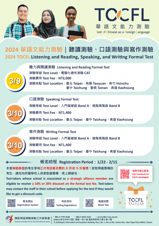 六、抽獎活動:凡報考任一測驗並完成繳費者,可參加華測FB粉絲專頁抽獎活動。詳情請見粉絲專頁貼文:https://www.facebook.com/SCTOP.TOCFL 。