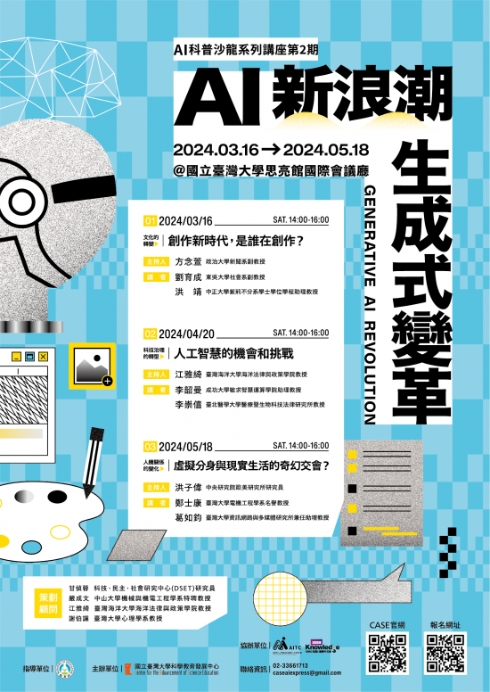 一、 為推廣AI科普教育,國立臺灣大學科學教育發展中心執行教育部「人工智慧技術及應用人才培育」計畫辦理「AI科普沙龍系列講座」活動。AI科普沙龍系列講座以AI文化及AI倫理為基底,規劃具備人文內涵之人工智慧科普系列講座,培養大眾對人工智慧使用、判斷、創造之能力。此期講座將針對生成式AI已經或即將帶來的衝擊為系列講座主題。預期引導參與觀眾和社會大眾理解近期可預見的職涯、工作機會、乃至社會各層面的變革。