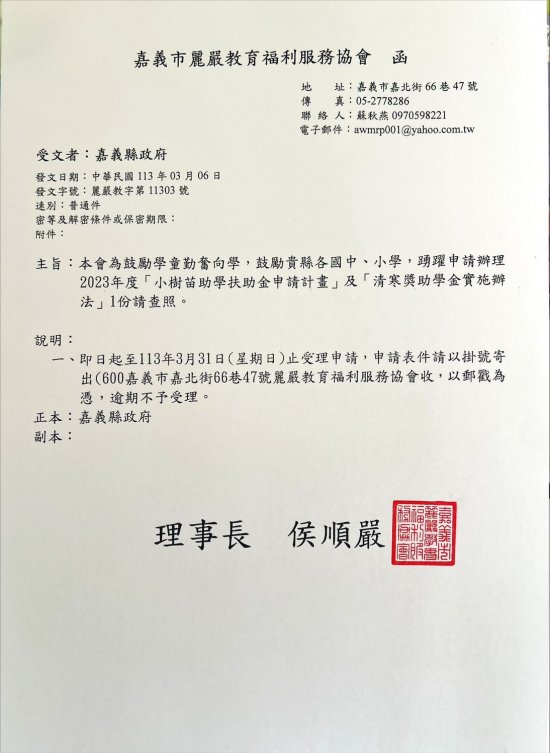申請表件請以掛號寄出(郵寄地址:600嘉義市嘉北街66巷47號,麗嚴教育福利服務協會收),郵戳為憑,逾期不予受理。