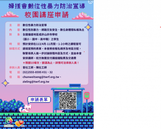 二:為促進青少年族群對於數位性暴力之認識,提升其在數位虛擬世界中辨識風險與自我保護之意識,並具備因應與預防數位性暴力之能力,該基金會規劃於本年度4月至11月,針對全國偏遠地區或非山非市學校(高級中等以下教育階段)之學生,辦理10場次「數位性暴力防治宣導校園講座」,由該基金會安排講師,申請學校無需支付講座鐘點費及交通費。