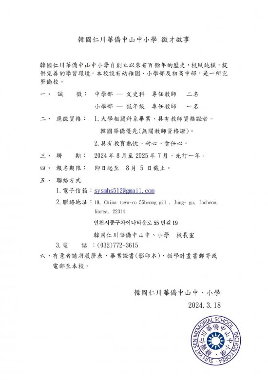 韓國地區仁川華僑中山中小學及漢城華僑中學本(113)年徵聘教師