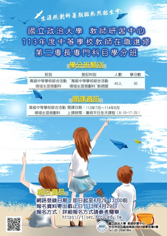四、 網路報名登錄至113年4月29日(星期一)中午12:00止。詳細資訊請參閱所附簡章內容或至該校教師研習中心網頁(http://tisec.nccu.edu.tw)查詢。聯絡電話:(02)2938-7894。