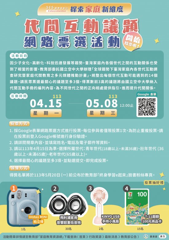 二、教育部委託國立空中大學辦理「全球趨勢下臺灣家庭內各世代互動調查研究暨家庭代間教育之多元媒體推動計畫」,統整出世代互動相關議題,特辦理旨揭票選活動(投票網址:https://docs.google.com/forms/d/e/1FAIpQLSeGp3mRTQRr4rl28F13Ur-R5gcY7LVV13cyNRRHB5LqiyfSnQ/formResponse),票選結果將列為未來研編代間互動學習手冊之參考依據。