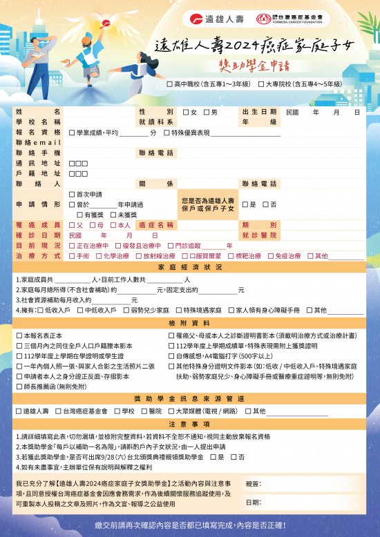 附件「2024台灣癌症基金會x遠雄人壽-癌症家庭子女獎助學金」活動DM