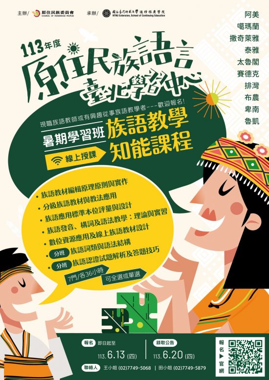 一、本班招生對象針對有意從事阿美族、噶瑪蘭族、撒奇萊雅 族、泰雅族、太魯閣族、 賽德克族、排灣族、布農族、卑南族、魯凱族等族語教學或語言推動工作者。