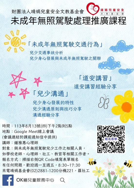 二、有鑒於此,該會期待透過辦理未成年無照駕駛處理推廣課程,藉由邀請心理師分享於道安講習終與未成年無照駕駛家庭上課的經驗,讓相關工作者透過本次課程交流,一同了解如何與少年談未成年無照駕駛,同時使未成年無照駕駛再犯的可能性降低。