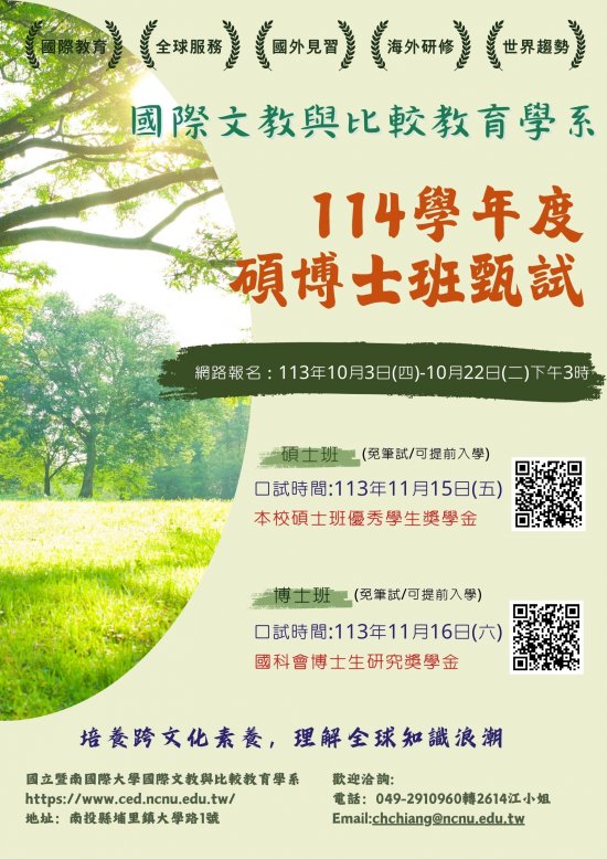 二、該系致力於研究世界不同國家的教育系統以及其社會、經濟與文化脈絡,並培養比較教育學術研究與國際文教管理人才,鼓勵及協助學生爭取政府經費,出國進行交換、志工服務與實習。相關資訊請參考http://www.ced.ncnu.edu.tw;併檢送該系招生海報。