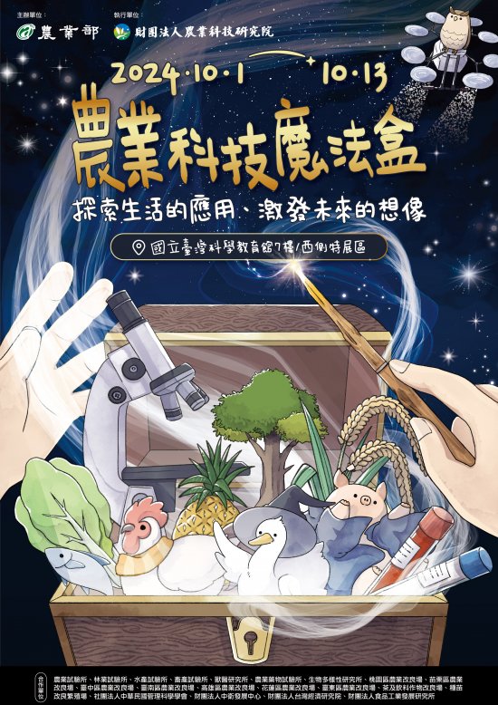 一、 為鼓勵民眾認識農業科技實務運用情形,農業部首度邀集所屬試驗改良場所及相關學校與法人,精選日常生活可見之農業科技研發成果,辦理「農業科技魔法盒」科普特展。