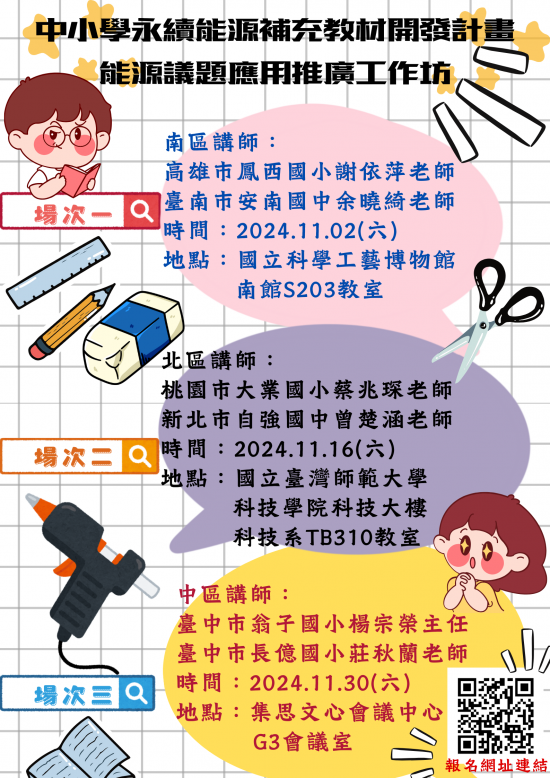| (三) | 中區場次,日期:113年11月30日(星期六)。課程時間:上午10:00至17:00;地點:集思文心會議中心(G3會議室);實作活動:溫差發電攪拌機、小小水車發電機。 |