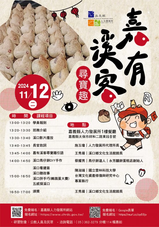 11/12人力發展所與溪口鄉文化生活館共同舉辦「嘉有溪客尋寶趣」,邀請鳥仔餅達人蔡耀男師傅現場帶領學員DIY手作,以及陳淑端老師引領大家以五感體驗溪口文化之美,歡迎公教人員及民眾線上報名參加。