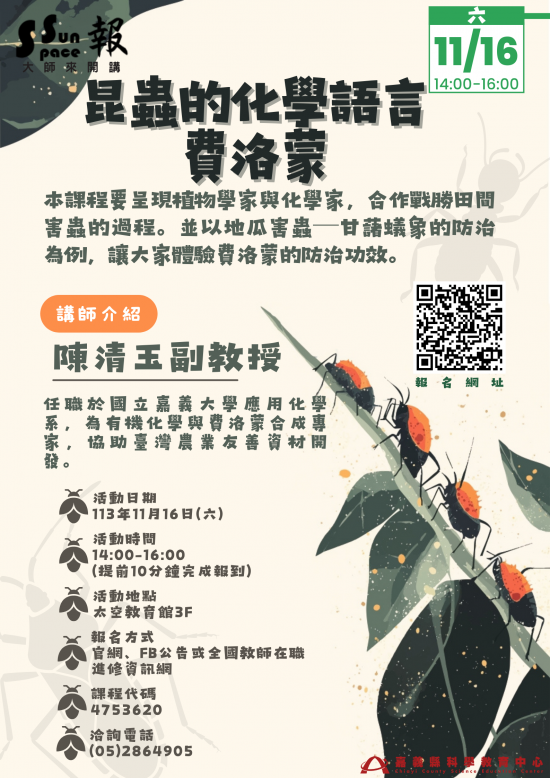本課程要呈現植物學家與化學家,合作戰勝田間害蟲的過程。並以地瓜害蟲─甘藷蟻象的防治為例,讓大家體驗費洛蒙的防治功效。