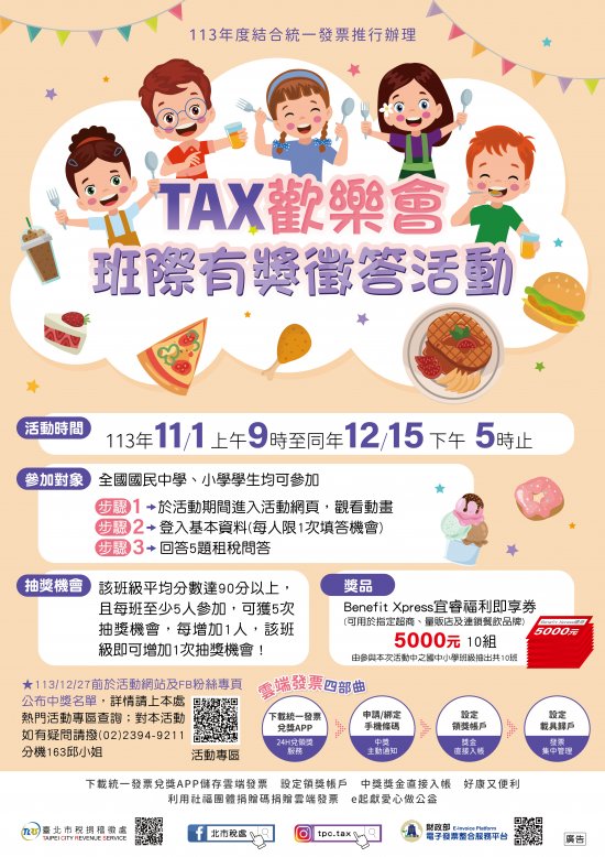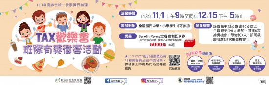 | 三、 | 活動詳情請參閱活動網頁(網址:https://services.arpa.tpctax.dof.gov.taipei/act/113taxfun/)。 |