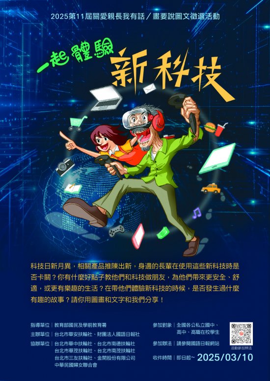 二、為鼓勵高級中等學校及國民中學學生勇於表達對親長的關愛,財團法人國語日報社與臺北市華安扶輪社共同辦理第11屆「關愛親長 我有話/畫要說」圖文徵選活動,並自即日起至114年3月10日(星期一)止徵件。參加辦法請參見附件,或逕自國語日報社網站下載(https://www.mdnkids.com/events/20241115-talkdrow/)。