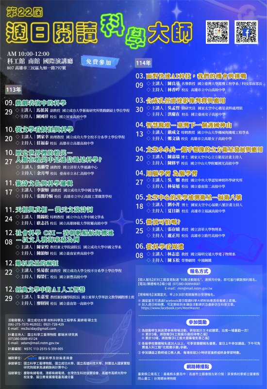 二、114年3月至114年6月份講座場次表及海報,如附件,演講地點於國立科學工藝博物館南館國際演講廳,每場講座亦核發參加教師2小時研習時數,以及參加公務人員核予2小時進修時數,本講座亦提供現場直播,歡迎透過週日閱讀科學大師官網http://science.nchc.org.tw/web即時收播。