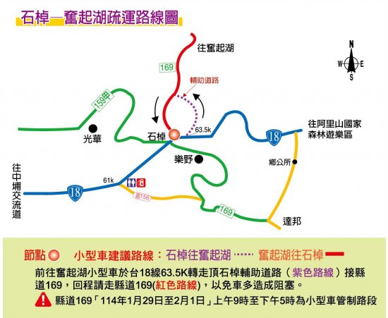 有關114年春節期間169線石棹至奮起湖路段實施小客車單行管制公告,請用路人留意。