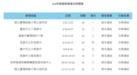 (八)第八場次師大2場:114年11月15日(星期六)至11月16日(星期日);研習地點:國立臺灣師範大學公館校區;報名連接: