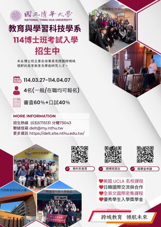國立清華大學教育與學習科技學系114學年度博士班考試入學招生訊息