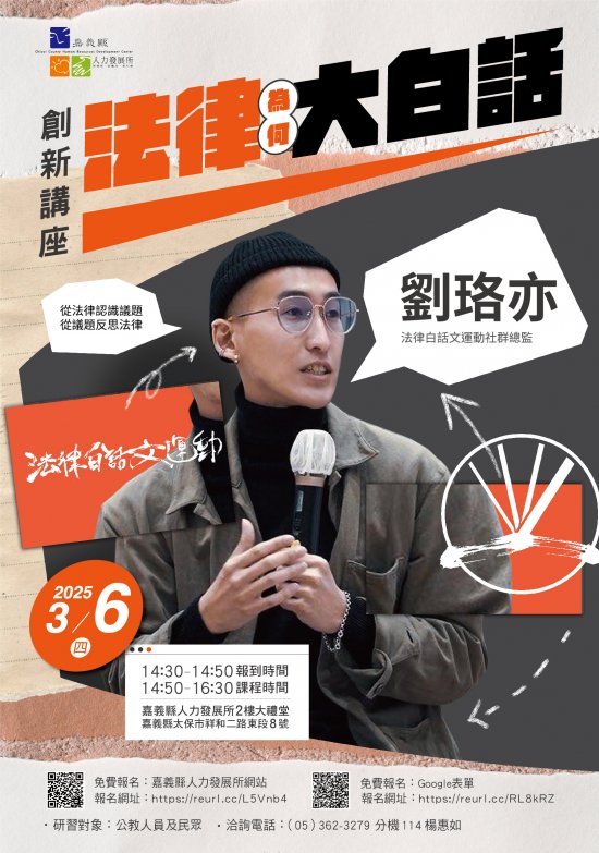 嘉義縣人力發展所將於36日下午250分舉辦「法律為何大白話」講座,邀請法律白話文運動社群總監劉珞亦蒞臨演講,以實際的法律案例為開首,分享「什麼時候大家會想了解法律?」、「過去法律傳遞產生什麼問題?」及「法律如何白話的三個方法」主題。