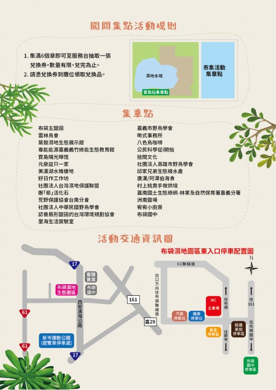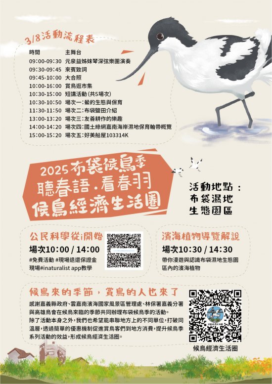 本府訂於114年3月8日(星期六)上午9時至下午4時30分於布袋濕地生態園區舉辦「 2025布袋候鳥季~聽春語.看春羽」活動,鼓勵師生家長踴躍參加。