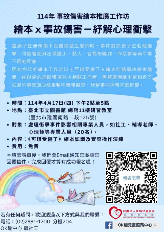 一、該會OK繃中心擬辦兒童事故傷害繪本推廣工作坊,以《可琪受傷了》繪本討論事故傷害議題,讓相關專業人員能夠學習運用繪本,協助曾有事故傷害經驗的孩子紓解情緒與衝擊。請鼓勵所屬踴躍參加。