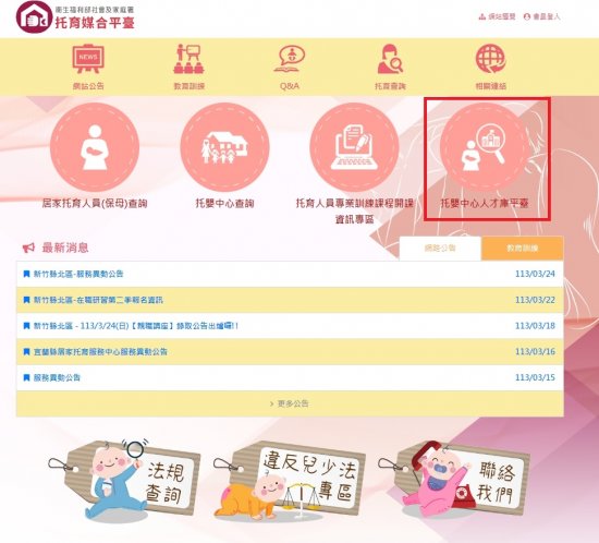 一、衛生福利部社會及家庭署推廣建置「托嬰中心人才庫平臺」,提供各高級中等學校幼兒教育、幼兒保育、家政科之學生參考及使用。