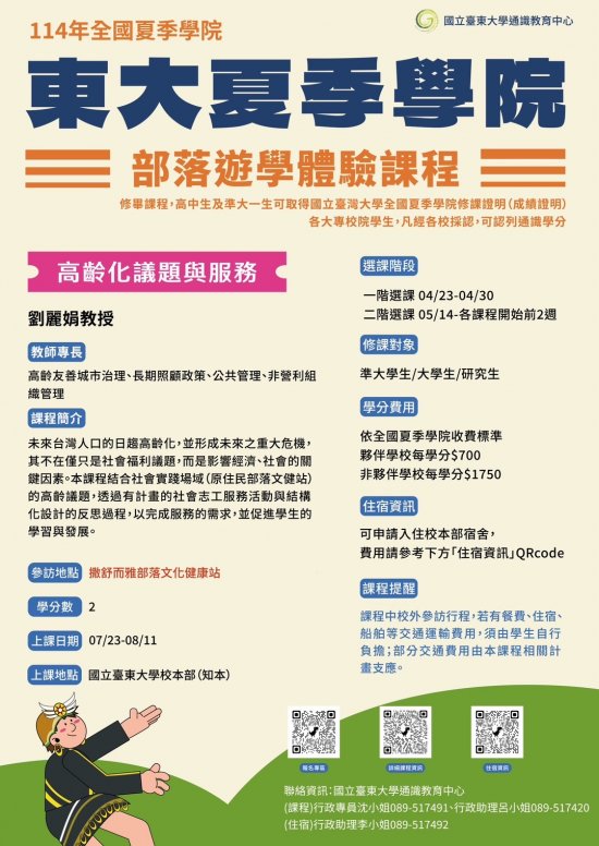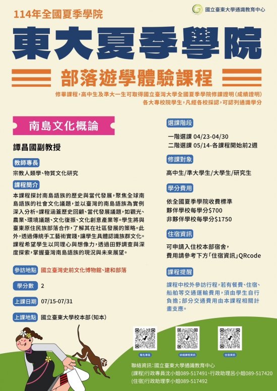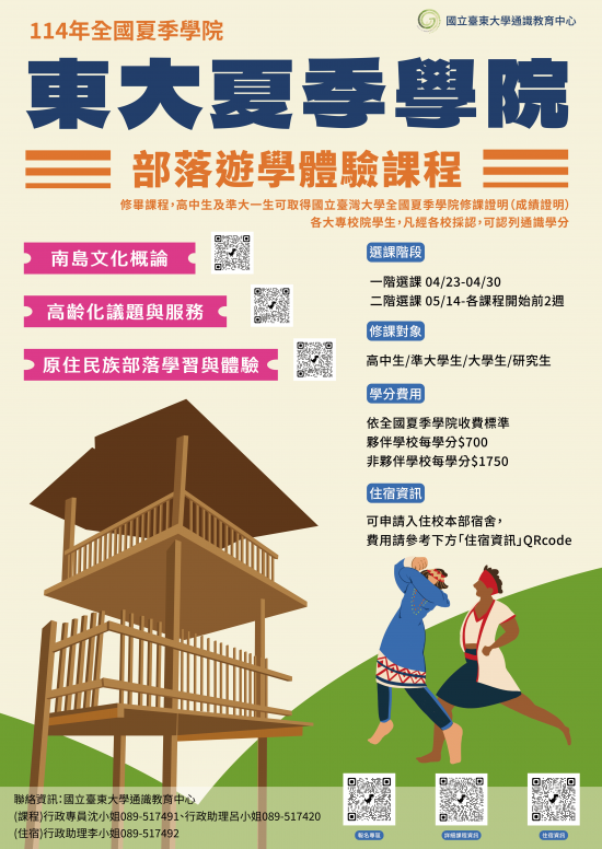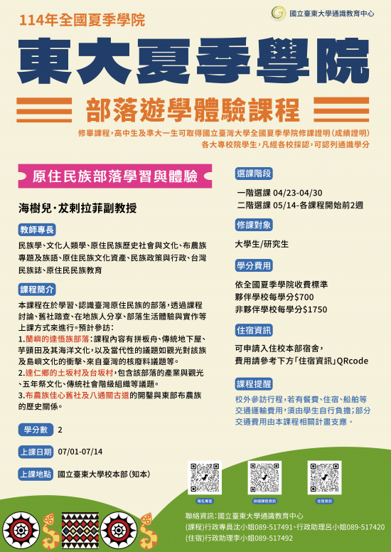 一、旨揭活動為國立臺東大學夏季學院開辦之「部落遊學體驗課程」,以協助推動全民原教,歡迎高級中等學校原住民學生及非原住民學生報名參加,課程結束後可取得國立臺灣大學頒發之修課證明。