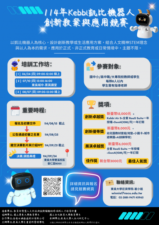 二、 競賽主題及目標:以「凱比機器人」為核心,設計創新教學或生活應用方案,結合人文精神、STEM理念與以人為本的需求,應用於正式、非正式教育或日常情境中,創造更具實用性的教育與科技融合方案。