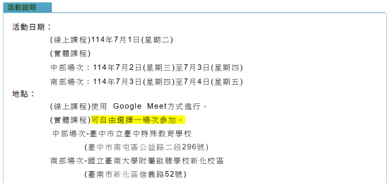 講習日期:(線上課程)114年7月1日、(實體課程)中部場次:114年7月2至3日;南部場次:114年7月3日至4日。