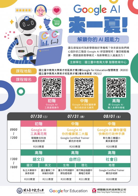 一、 為提升師生數位教學及人工智慧應用之能力,旨揭課程內容涵蓋Google AI 工具基礎操作、Google AI 在校園教學與行政的多元應用、將 Google AI 融入各學科領域等,課程資訊如下:
