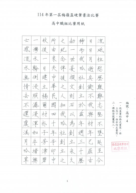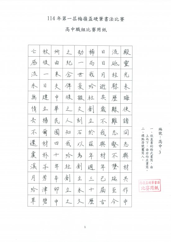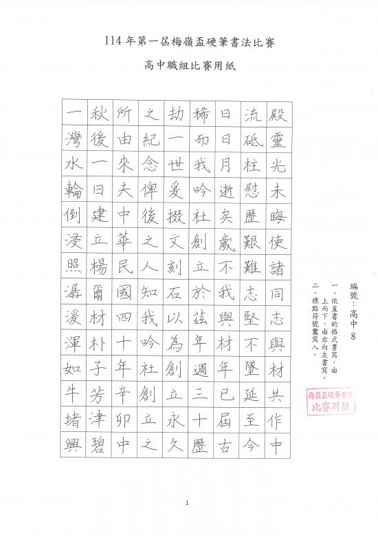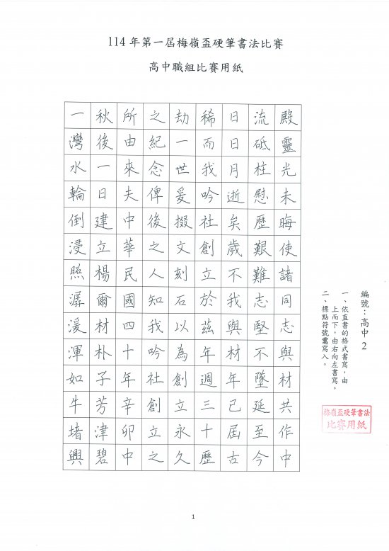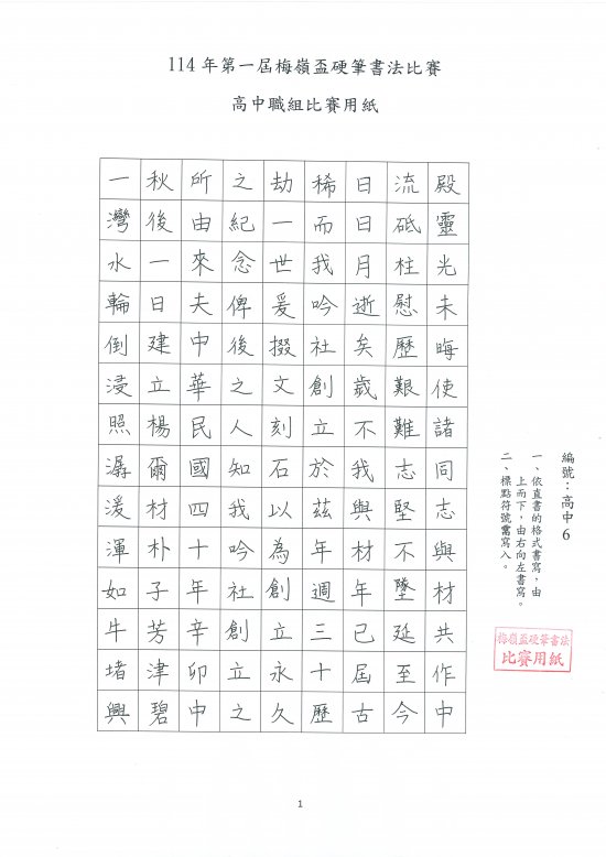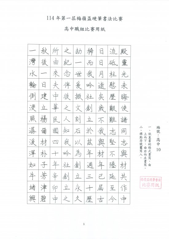 114年度『梅嶺盃』硬筆書法比賽高中職組成績公布