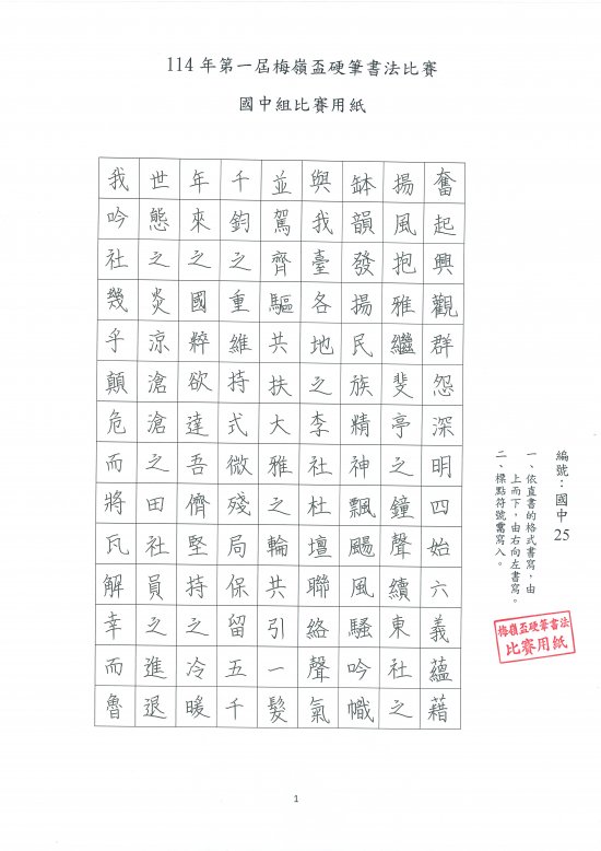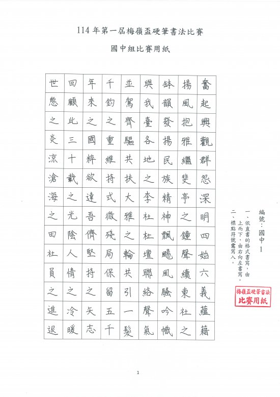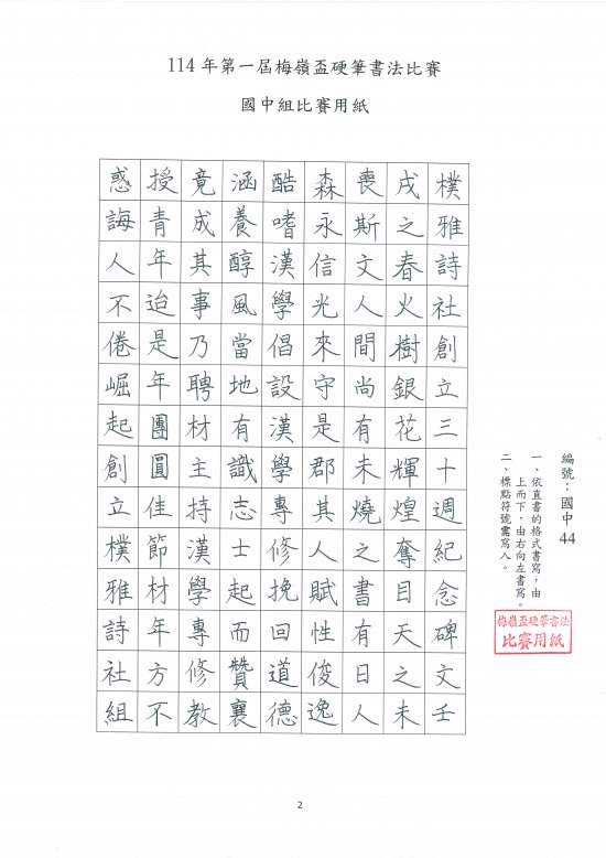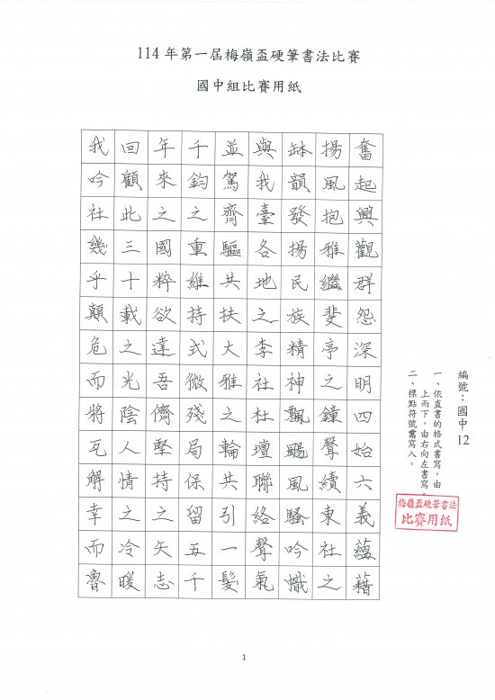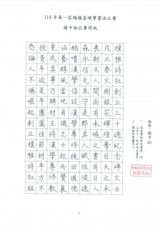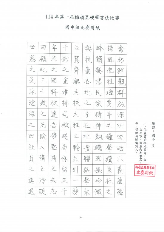 114年度『梅嶺盃』硬筆書法比賽國中組成績公布