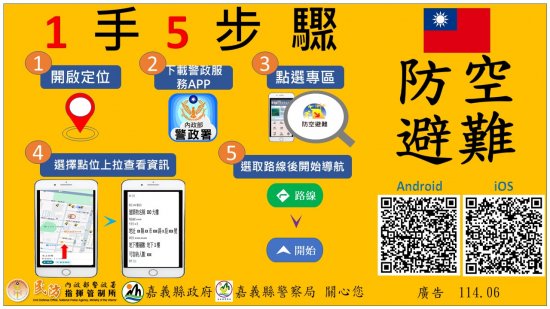 - 另檢附嘉義縣政府公告、宣導單、QR碼、「查詢空襲防空疏散避難處所」宣傳圖檔2份,請張貼宣導;並請學生轉知家人配合執行。