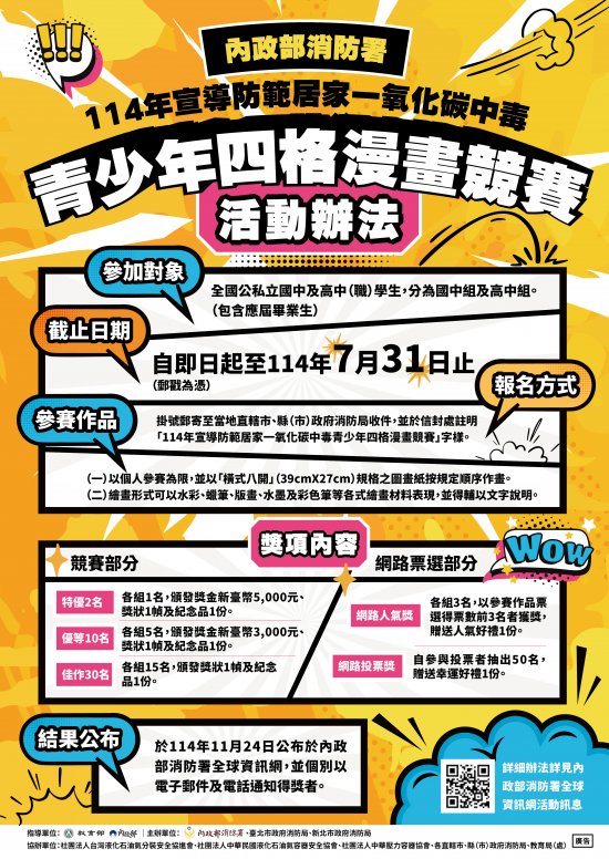 內政部消防署辦理「114年宣導防範居家一氧化碳中毒青少年四格漫畫競賽」活動