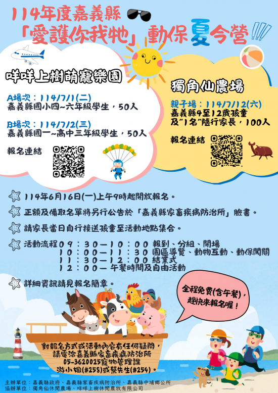二、為提升孩童之動物保護觀念,旨揭活動由本所、嘉義縣中埔鄉公所、咩咩上樹休閒農牧有限公司及獨角仙休閒農場共同辦理。