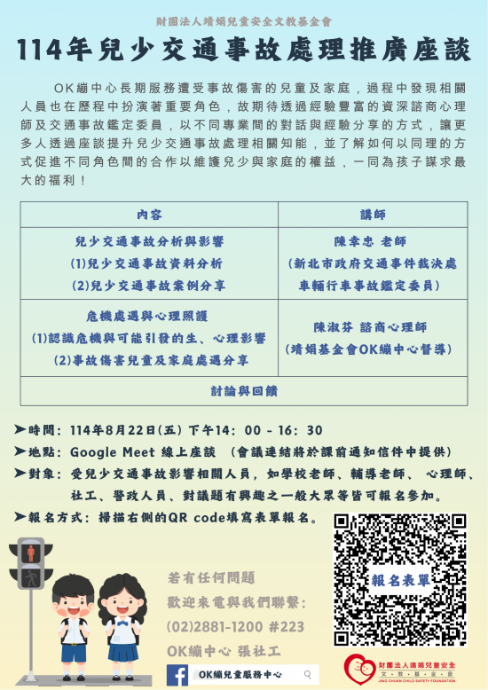 二、請鼓勵所屬踴躍參加,檢附「114年兒少交通事故處理推廣座談」宣傳單張1份。