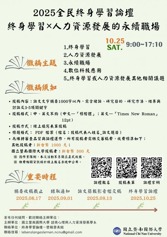 一、旨揭壁報論文海報以「終身學習、人力資源發展、永續職場、數位科技應用、終身學習或人力資源發展其他相關議題」為主題,歡迎踴躍投稿。 二 、論文摘要投稿截止日為114年08月17日(星期日),正式壁報論文展示影音檔繳交截止日為114年9月13日(星期六)。 三、相關訊息可至壁報論文投稿報名網頁查詢,網址:https://reurl.cc/nm3dO1。 四、檢附海報1份,如附件。