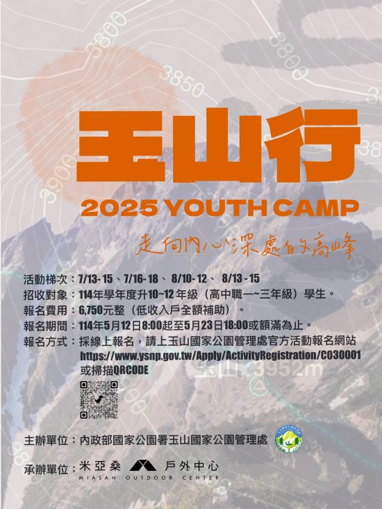 二、第4梯次活動時間為8月13日(星期三)至15日(星期五),自即日起開放報名至7月10日止,參加對象為114學年度屬(升)10~12年級高中職生,為期3天2夜,活動地點含括本園塔塔加遊憩區及玉山主峰線。