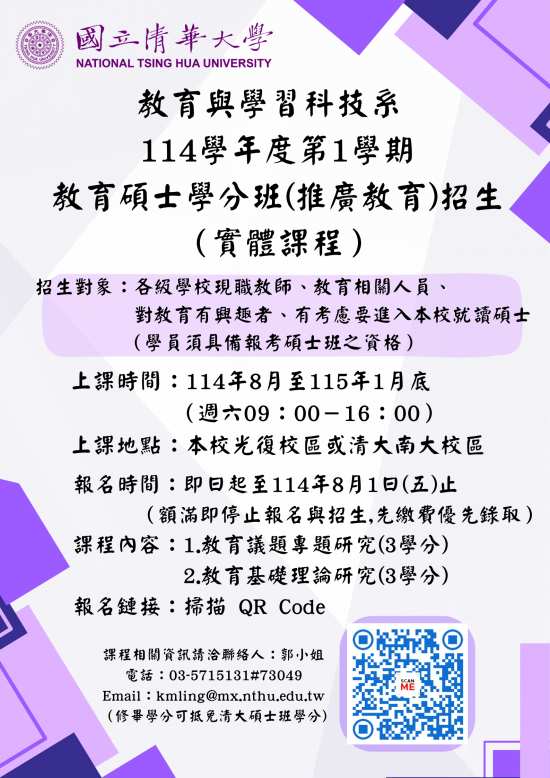 四、相關訊息將公告於清華大學教育與學習科技學系首頁最新消息(網址:https://delt.site.nthu.edu.tw/),如有相關問題請洽郭小姐,聯絡電話:03-5715131分機73049,電子信箱:kmling@mx.nthu.edu.tw。