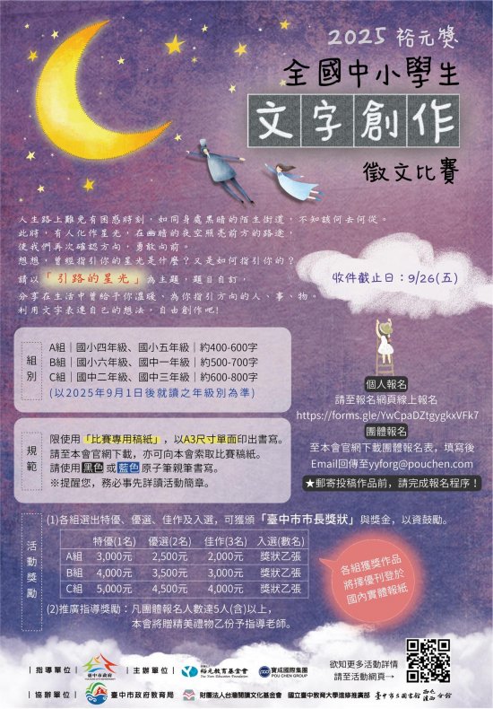 四、協辦單位:臺中市政府教育局、財團法人台灣閱讀文化基金會、國立臺中教育大學進修推廣部、臺中市立圖書館西屯分館、臺中市立圖書館溪西分館。
