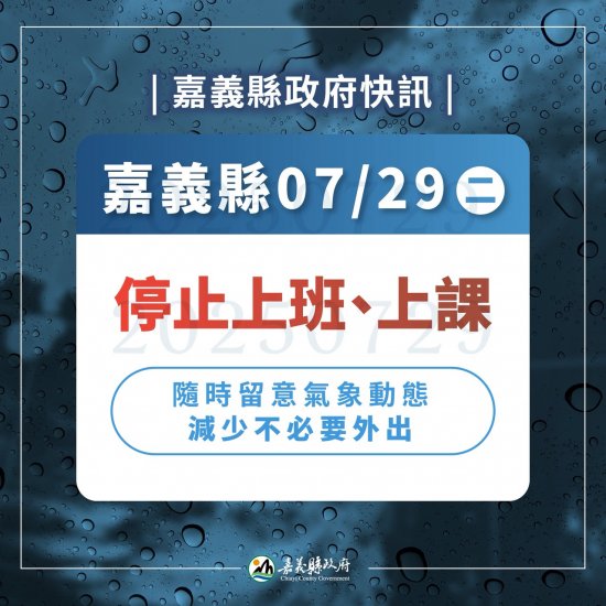 因應嘉義縣政府公告受低壓豪大雨影響,嘉義縣政明日(7/29)停止上班、停止上課。