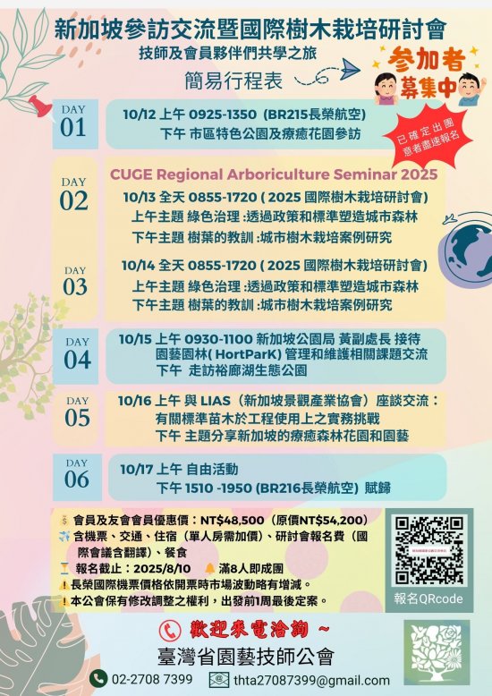 一、 為促進專業交流與實務深化,該會將帶領大家拜訪新加坡公園局、LIAS景觀協會,實地了解綠化維護技術與應用,並同時參加2025年CUGE國際樹木栽培研討會,掌握全球最新綠化趨勢與樹木管理策略。