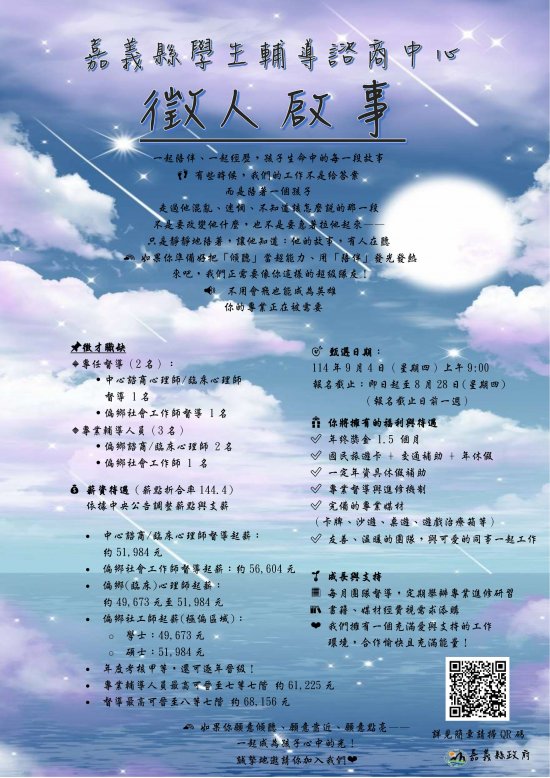 轉知114年度嘉義縣學生輔導諮商中心第五次專任專業輔導人員及督導甄選