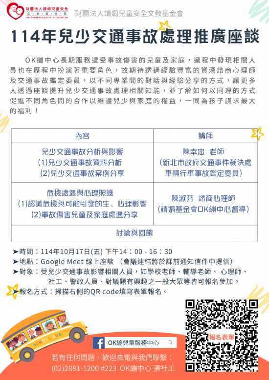 二、檢附114年兒少交通事故處理推廣座談宣傳單張1份。