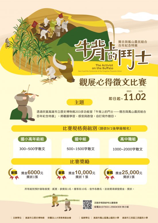 二、2025年為鳳山農民組合成立100周年,該館與財團法人大眾教育基金會合辦「牛背上的鬥士─簡吉與鳳山農民組合百年紀念特展」,向大眾介紹臺灣農民運動,展現鳳山農民組合如何為今日臺灣的自由民主生活奠定基礎;並傳遞簡吉先生不畏艱難援助貧苦佃農,守護臺灣農村的正義感和不屈精神。該館邀請國中小及高中學校師生前來參觀,透過欣賞展覽與聆聽導覽解說讓更多青年學子認識簡吉先生的生平及臺灣農民運動發展。為鼓勵青年及學童熟悉在地歷史,特舉辦觀展心得徵文比賽,藉此了解學生對臺灣農民運動的見解與感想。