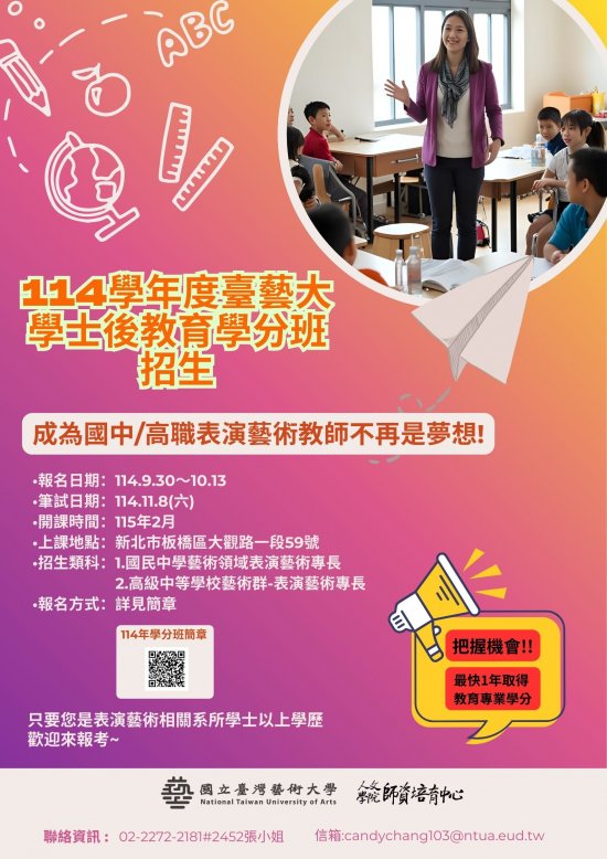 1) (附件)國立臺灣藝術大學辦理114學年度學士後教育學分班招生海報.jpg